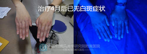 ▲主诉:双手部白斑1年,曾使用外用药(药名不详)、口服药,效果不佳,今日来我院就诊。