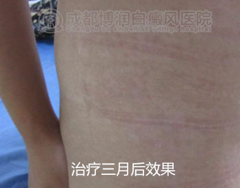 主诉:右髋部白斑2月,在当地医院治疗,无明显效果,出现扩散。