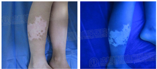 wood灯:左下肢 有斑片状色素脱失性白斑,边界不清晰