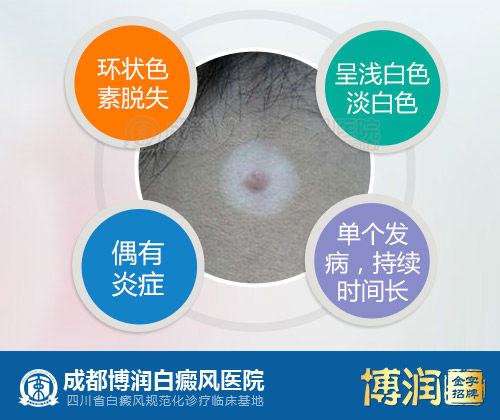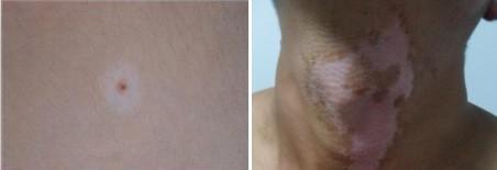 2、离心性白斑以黑痣为中心,多为圆形,周边无色素沉着带。