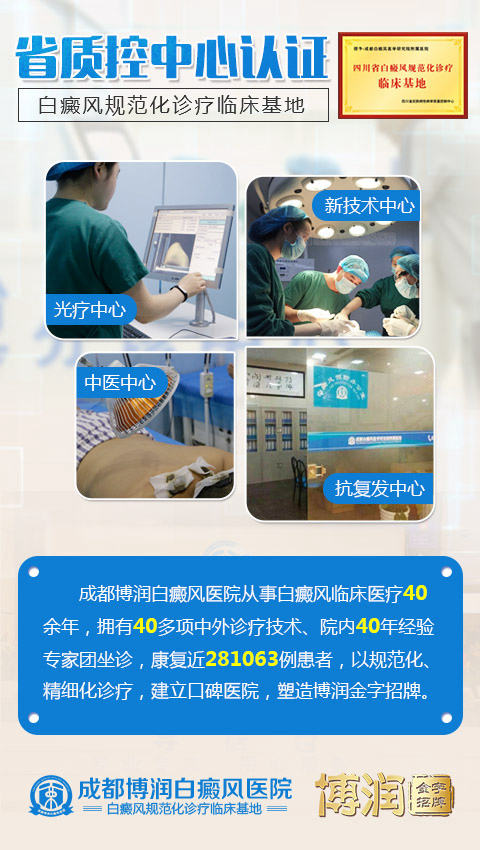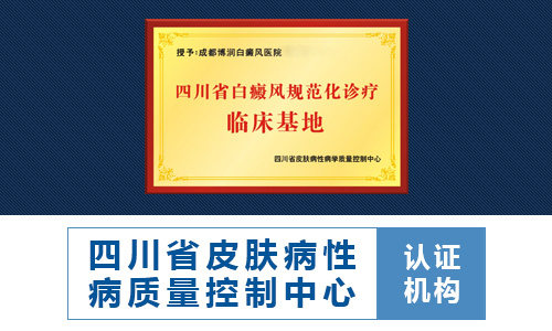 2015年,由四川省皮肤病性病质量控制中心主办,成都博润白癜风医院院承办的"2015年四川省白癜风规范化诊断治疗及新技术应用研讨会"4月25日上午在中国成都召开。来自国内数百位白癜风、皮肤病专家学者将济济一堂,为中国皮肤健康事业发展建言献策,成都博润白癜风医院被认证为"四川省白癜风规范化诊疗临床基地"。