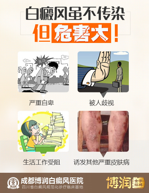 1.白癜风易扩散到暴露部位,严重影响个人外在形象,对患者正常的学习、就业、婚姻、家庭、社交等等造成较大影响;