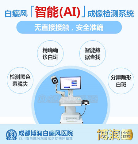 要快速康复孩子白斑,确诊是极为重要的第一环。为了更加精准、科学的检测出具体的病情、病因,成都博润白癜风医院引进白癜风智能AI成像检测系统,成为国内仅有的几家拥有该仪器的专业医院;同时聘请专业操作医师,用智能AI轻松检测白癜风,并可与其他白斑疾病相鉴别。为后续的治疗奠定基础。