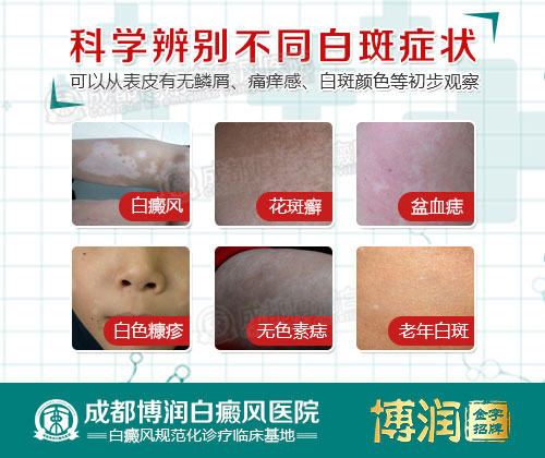 出现白斑情况有很多,临床上较为常见的白斑有:白癜风、花斑癣、白色糠疹、无色素痣等,仅靠肉眼是难以准确辨识的,必须要经过专业检测才能确诊,才能避免错诊、误诊现象的出现,避免加重白斑病情。