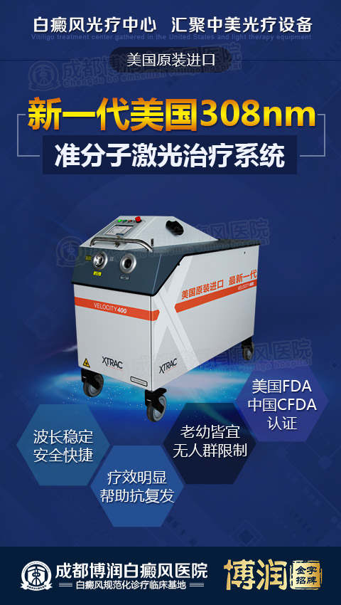 308准分子激光治疗是目前较为普遍的一种技术,而成都博润引进的新一代“美国308nm准分子激光治疗系统”,集成了308nm XeCl准分子激光光源、计算机照射剂量精密控制和最新的液体光导传输(LLG)等多项技术,使皮肤酪氨酸酶的活性增加,黑素细胞合成的黑色能力加强,同时对表皮有免疫抑制作用。与传统的治疗方法相比疗程更短,见效更快。不受部位、年龄限制,能为患者提供强有力的疗效保障。