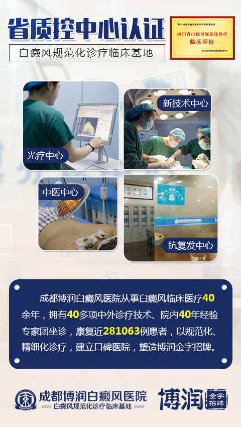 作为四川省白癜风规范化诊疗临床基地,白癜风专业医院“金字招牌”,除了美国308激光治疗,我院更会针对患者实际病情发展,采取各种医疗方式综合治疗,如智能308、recell细胞再生术、中药熏蒸等,专门设立“光疗中心、新技术中心、中药中心、抗复发中心”四大分诊中心,检查、治疗、抗复发全面到位,做到一人一方、中西结合、多维治疗,一切从疗效出发,为患者提供规范、贴心的诊疗服务。