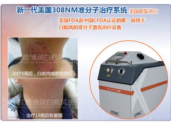 由我院引进的先进仪器,如308准分子光,能深入到皮下病灶部位,刺激增加黑色素,经常用于治疗早期白癜风,再搭配中医治疗,更起到显著的疗效。其中还有美国308、智能308,更是白癜风医疗领域的前沿技术。
