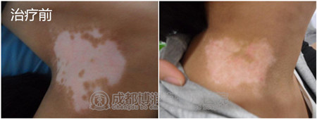 4、无效:白斑部分消退或缩小,恢复正常肤色的面积占皮损面积<10%,或白斑无色素再生或范围扩大。