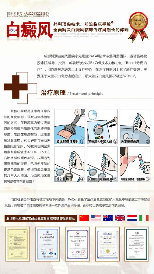 目前国内最先进的治疗仪器和技术是:智能308和Recell细胞再生术。智能308是将智能与308激光治疗结合,智能定位白斑患处,智能治疗,消除了旧版308的控制存在不准的弊端。而Recell细胞再生术,突破了自体表皮移植方法一次性治疗面积受限、面积较大的需多次治疗等弊端。从患者的治疗反馈来看,恢复效果也是明显的。