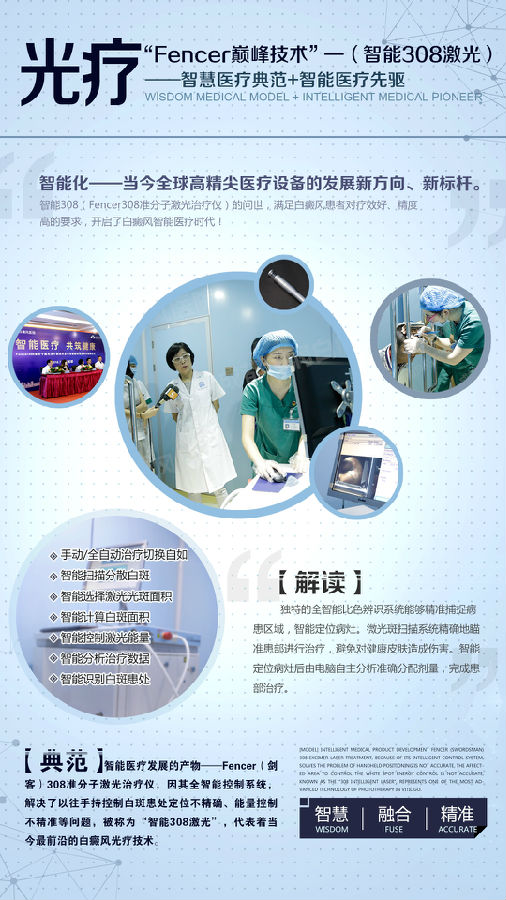 经过40多年临床科研,研发出一套中西医结合的治疗白癜风临床手段。医院还拥有以智能308为主的完整的光疗系统、以Recell细胞再生术为核心的手术治疗系统,此外配合中药,立体综合治疗,内调外治,做到一人一方、个性化治疗,使白癜风彻底不复发。目前,医院的临床康复案例已近万人。