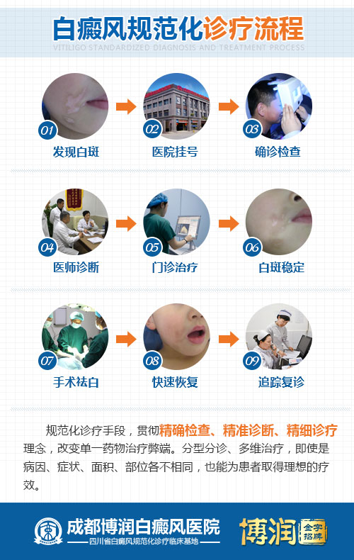 成都博润将继续以“专业研究白癜风,专业治疗白癜风”为己任,推广白癜风规范化诊疗,为更多患者带去康复,不负医院“金字招牌”、“规范化诊疗临床基地”的荣誉!