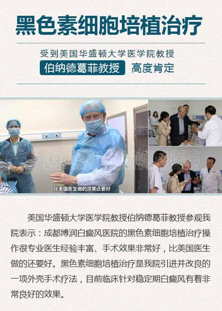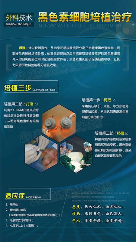 通过仪器操作,从自身正常皮肤提取分离正常健康黑色素细胞,提取好后再经过培植分离,处置白斑部位然后再把提取培植分离好的黑色素细胞介入的白斑的部位同时配合细胞营养液,黑色素生长因子促使细胞吸收,包扎七天后拆敷料就能看见明显效果。