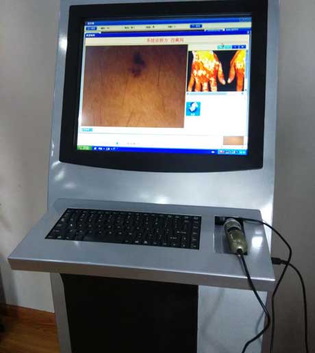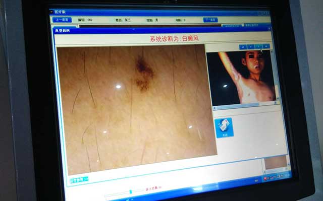 皮肤镜检查是一种在人体上应用且无创的诊断技术,它可以放大皮肤,观察到表皮、表皮和真皮交界及真皮乳头的颜色和结构,肉眼往往难以观察到这些颜色和结构。先进的光谱成像技术,可透视到皮肤基底层,能够观察皮肤颗粒层以上的微细变化,在诊断色素改变性疾病及判断其黑色素缺失方面有着无可比拟的优势。逐渐成为国际上推广、普及的色素性皮肤病诊断工具。