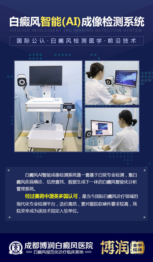 为了应对白癜风高发现状,扭转数广大患者治疗不规范,康复不佳的局面。成都博润白癜风医院引进智能医疗——白癜风智能(AI)成像检测系统,国际公认目前白癜风检测医学前沿技术,改变传统白斑检查漏诊与误诊的情况,把握住第一步精确检测,将白癜风规范化治疗进行到底。