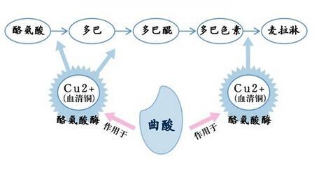 大量的医学研究和临床实验已经证实,酪氨酸酶(TYR)是黑色素合成的关键酶,它的活性与否将直接影响到黑色素的合成,而白癜风的主要表现就是黑色素细胞合成黑色素能力的降低,甚至是完全失去该功能。当体内酪氨酸酶活性降低,阻止了黑色素的合成代谢,就会产生皮肤局部色素脱失而形成白癜风。